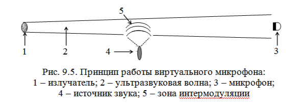 Первичные исследования были направлены только на обнаружение синтетических сигналов с высоким уровнем звукового давления. Однако практическое применение виртуальных микрофонов, разумеется, состоит в том, чтобы использовать ультразвуковые волны для прослушивания нормальной человеческой речи на расстоянии. Ультразвуковая волна сама по себе действует здесь как приемник звука. Никаких технических средств, типа мембран микрофонов, здесь вблизи источника звука размещать не требуется (рис. 9.5). Поскольку такого рода приемник звука невидим и неосязаем, его и назвали виртуальным микрофоном. Особую сложность при решении такой задачи представляет собой детектирование очень слабой модуляции ультразвуковой волны с минимально возможными затратами.Повышенное внимание следует уделять следующим вопросам: