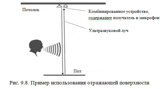 Весьма привлекательной выглядит идея, которая состоит в том, что весьма разумно было бы расположить излучатель и приемник в одном и том же месте. Ультразвуковая волна, отразившись от плоской поверхно-сти, например от стола или пола,вернется обратно и будет принята микрофоном. Тогда можно было бы конструктивно объединить передатчик и приемник в одном устройстве. Разместить такую систему можно, к примеру, на потолке, как показано на рис. 9.8.