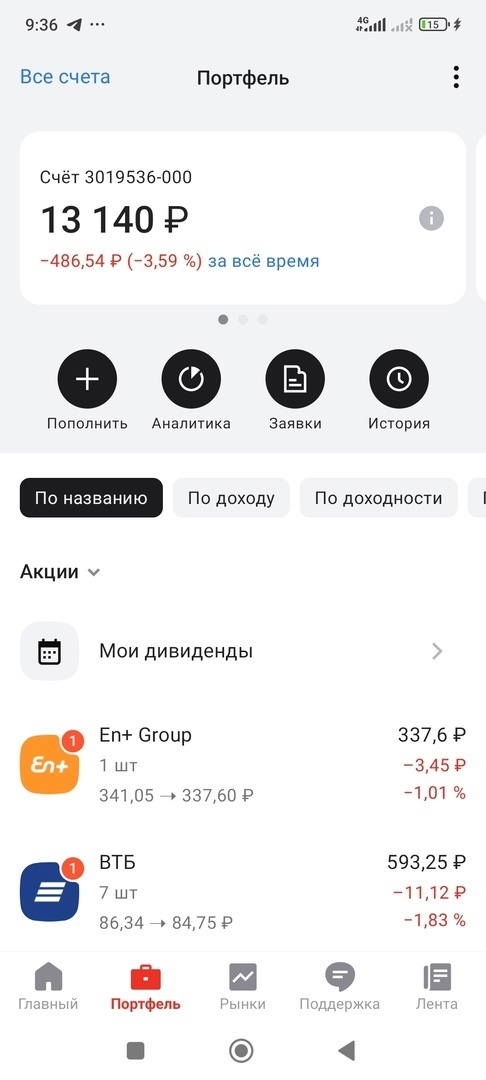 Как показал мой опыт, облигации и фонды гораздо стабильнее акций. Сейчас мой портфель в убытке почти на 500 рублей. И это только заслуга акций.