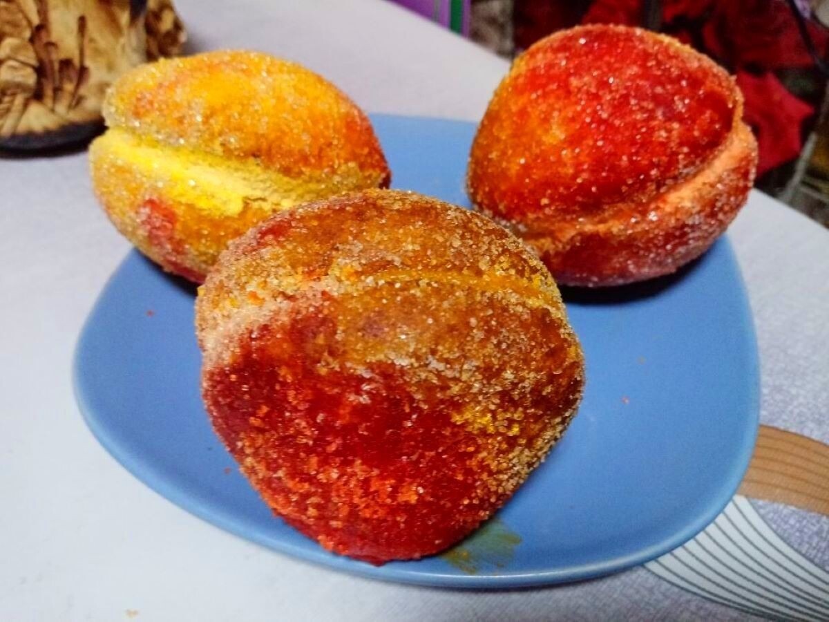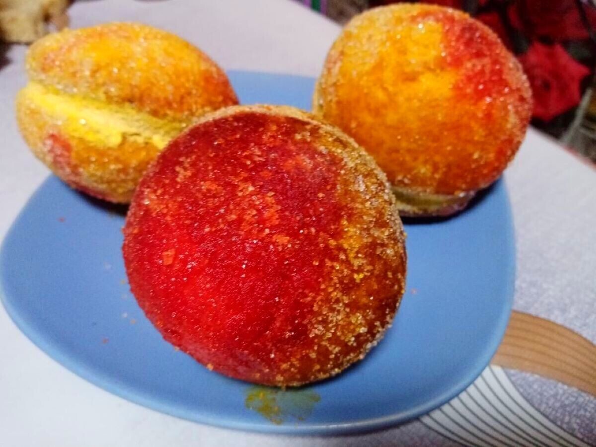 Теперь остаётся самый интересный этап! Обмакиваем "персики" сначала на 2/3 в морковный сок, а оставшуюся часть — в свекольный сок, а затем обваливаем в сахаре. Вот и всё! Ваши пирожные "персики" готовы, и они не только вкусные, но и невероятно красивые!