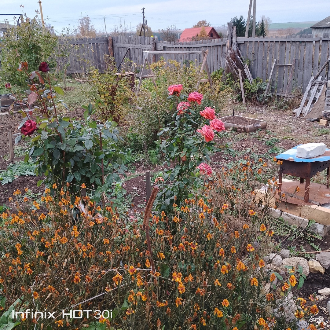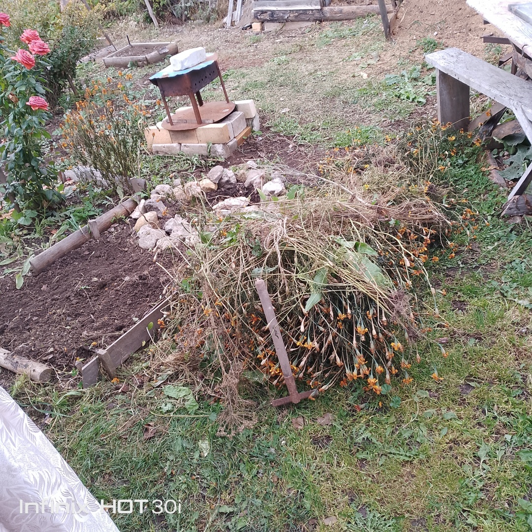 Немножко нашего огорода. У нас( Нижегородская область) долго было тепло. Начинаем постепенно всё убирать. Бархатцы в этом году разрослись. В пятницу убрали их.