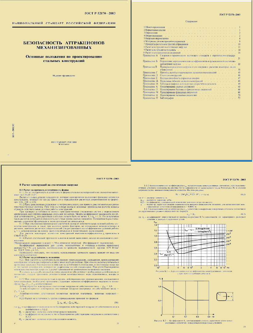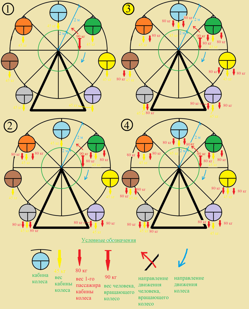 Обеспечение устойчивости в нерабочем и рабочем состояниях, при полной, симметричной и не симметричной нагрузках, определение усилий, необходимых для вращения и остановки индийского "чудо-колеса" требуют, как мне кажется, немалой смекалки и практического опыта. Для иллюстрации этого прикладываю копии фрагментов из российского ГОСТ Р 52170-2003 "Безопасность аттракционов механизированных. Основные положения по проектированию стальных конструкций" и несколько вариантов загрузки индийского аттракциона. Предполагаю, что европейские нормы к данному сооружению не менее жесткие. Тем не менее, колесо, построенное без ж.б. фундаментов или накладных грузов, работает со скоростью приблизительно 2-ух оборотов в минуту, которую обеспечивает шагающий без страховки по перекладинам колеса "живой привод".