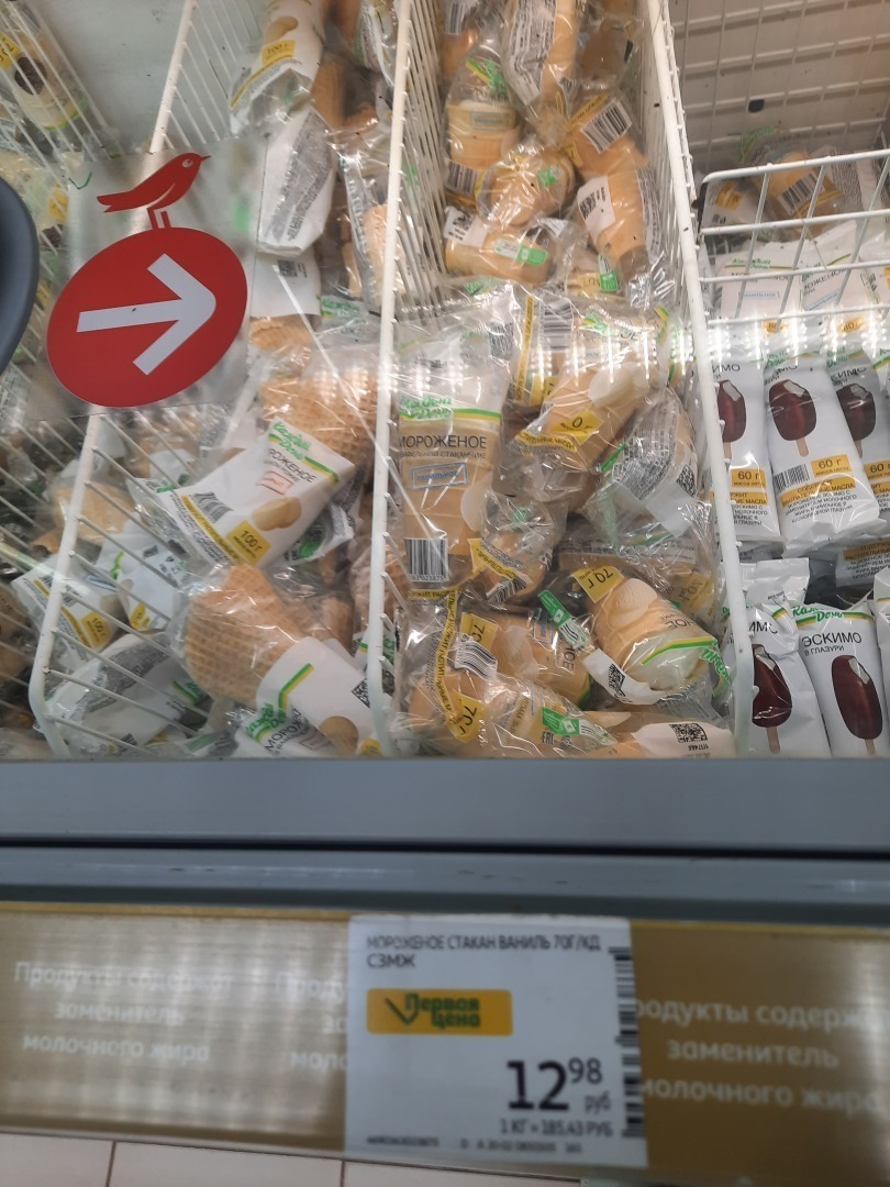 По теме: да, в "Ашане" действительно есть такое мороженое по цене 13 рублей (я округлила, хотя оно на две копеечки ниже по цене, на ценнике 12.98). Это знакомый всем небольшой стаканчик.