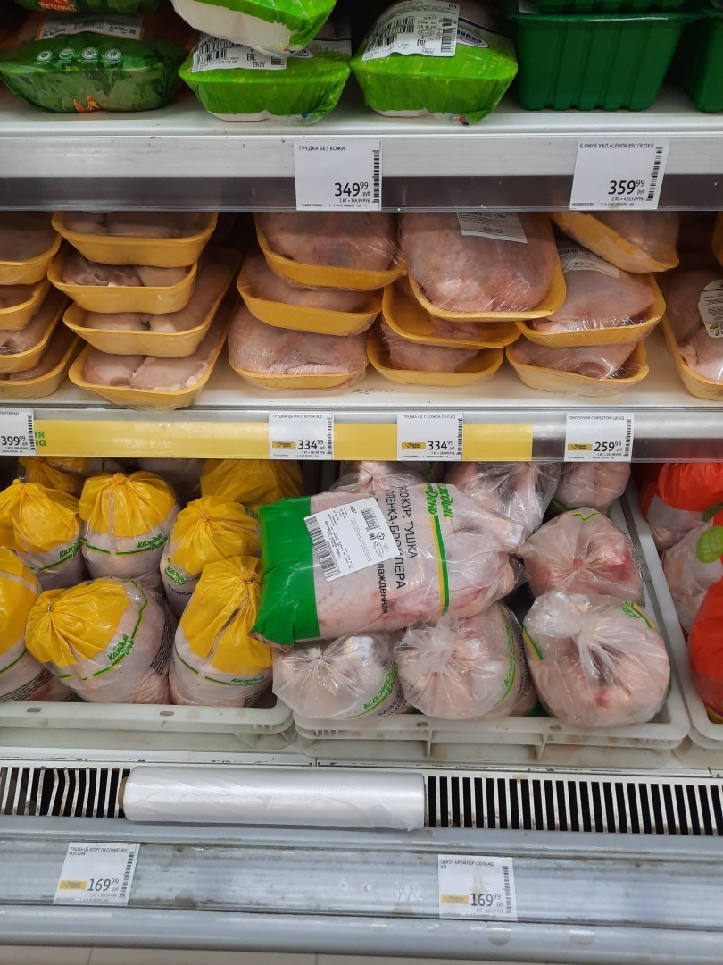 Раньше были по цене 150 рублей за кг, сейчас почти по 170 рублей. Зато ниже, чем в других магазинах. Правда, ещё есть такой магазин В1, в нем куры по цене были 160 рублей за 1 кг, но я давно не ходила.