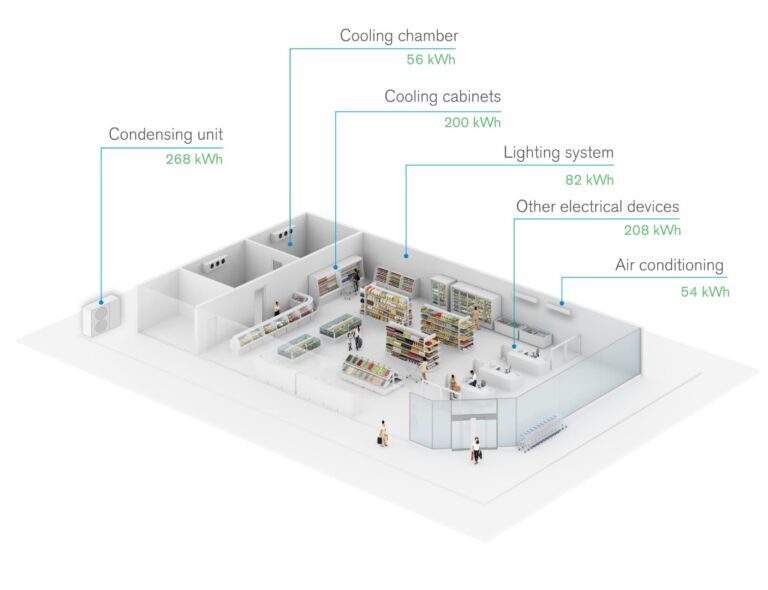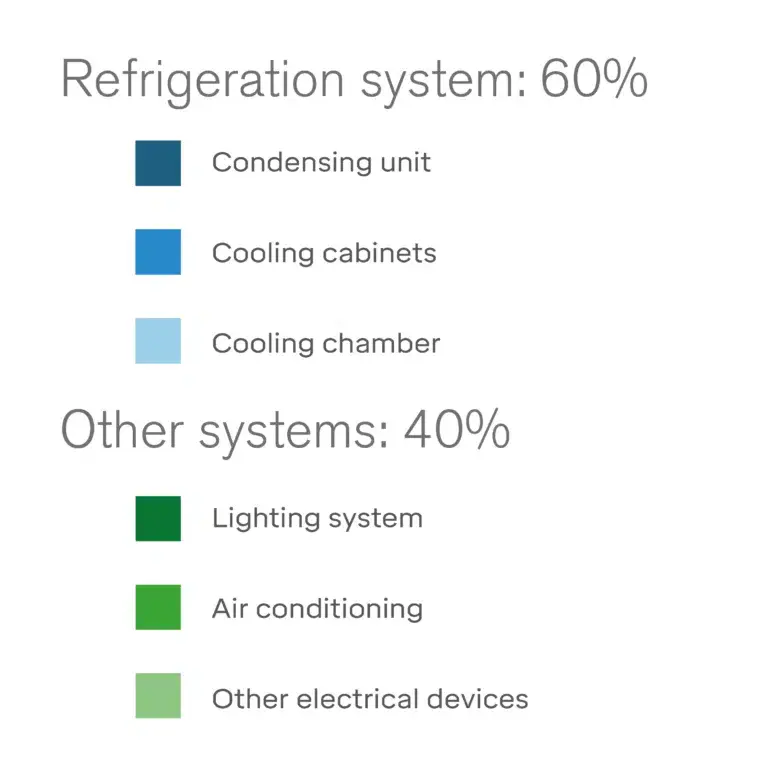 Вся холодильная система (конденсаторная установка, холодильная камера и холодильные витрины) составляет ~60% общего энергопотребления магазина , что в шесть раз больше, чем система освещения.