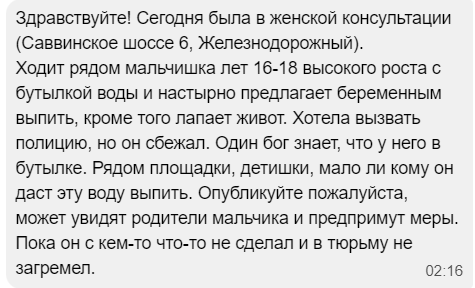 Он караулит возле женской консультации на Саввинском шоссе, пристает к беременным, заводит разговор, пытается прикоснуться к животу и предлагает употребить какой-то непонятный напиток.