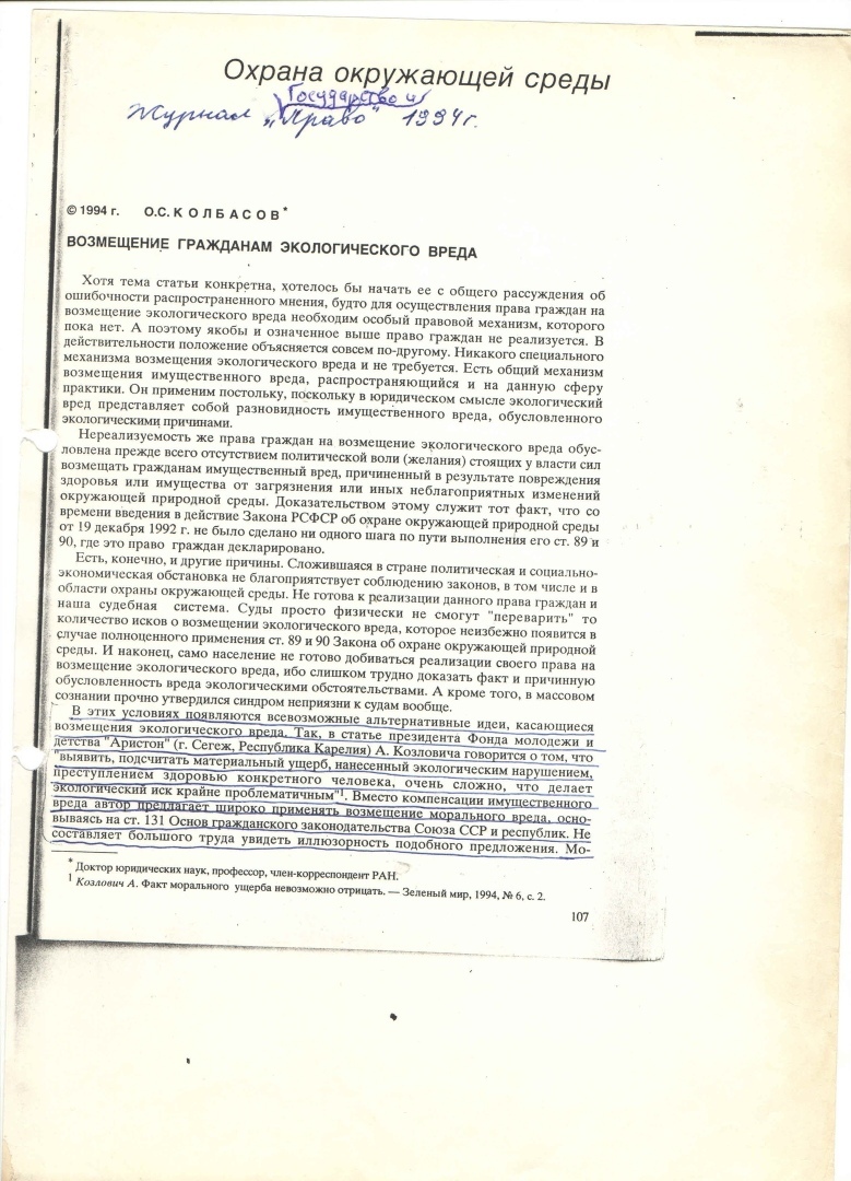 И «кремлёвские», как тогда шутливо говорил М. Задорнов, ни нашли ничего лучшего, как более чем пространно и более чем бестолково прокомментировать статью Андрея в журнале «Государство и право» большой статьёй академика Колбасова О.С. «Возмещение гражданам экологического вреда» (Государство и право. – 1994. – №10).
