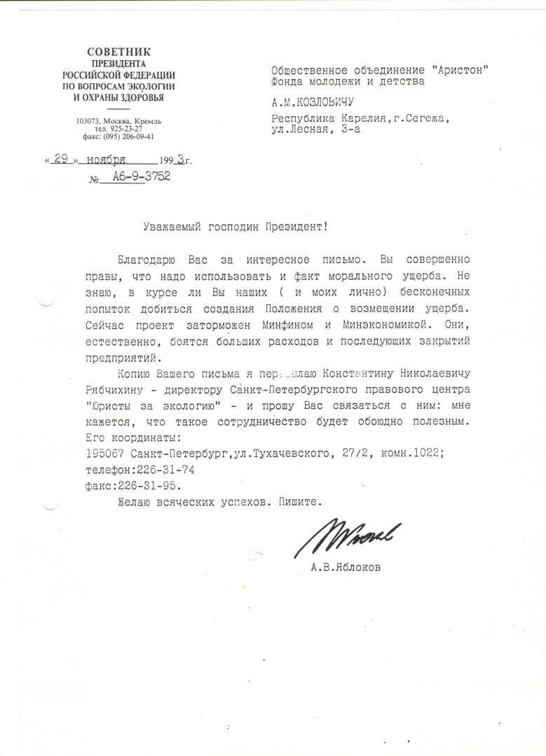 Андрей, предвидя это, решил написать личное письмо академику Алексею Владимировичу Яблокову ещё до публикации данной статьи и приложить к нему её текст. Алексей Владимирович был тогда советником Президента РФ.
