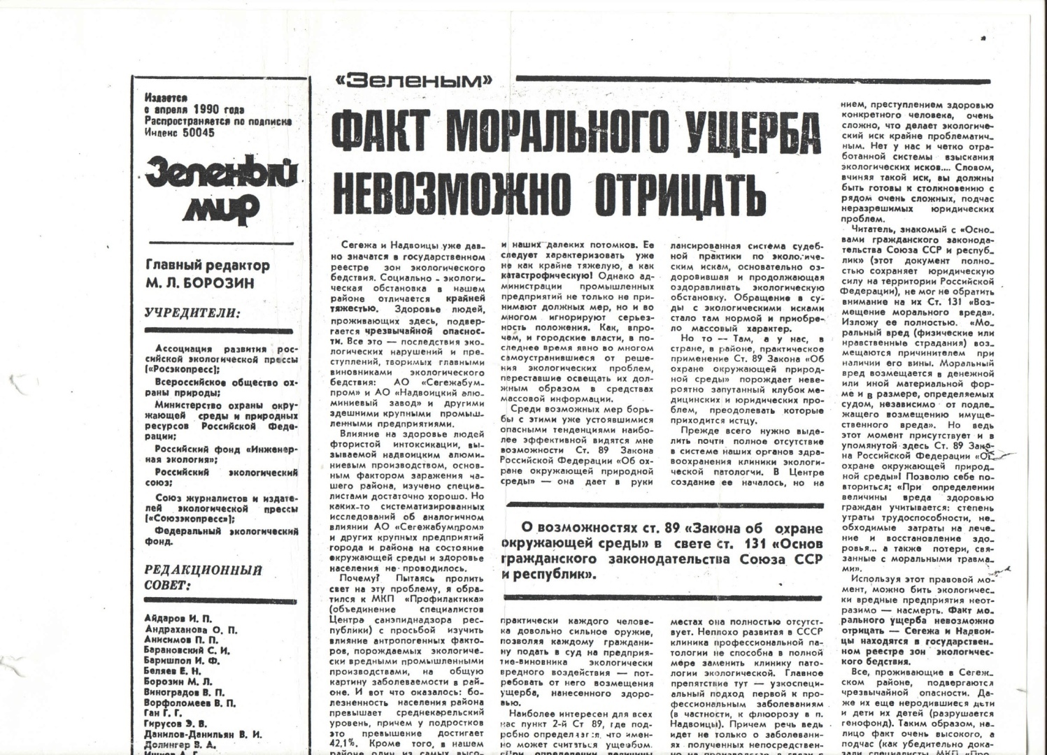 Вскоре статью опубликовала и центральная газета «Зелёный мир», орган Министерства экологии Российской Федерации (было тогда у нас и такое под названием «Факт морального ущерба невозможно отрицать»). Извиняюсь, она опять не уместилась в скан целиком, но раз текст дан, то, наверное, это не имеет значения. Скан вот: