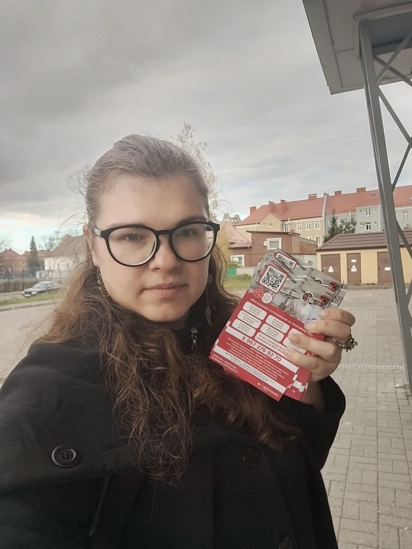 Я уложилась в три часа. На руках оставалось штук 20 листовок. Их я раздала по возвращению в Знаменск. За поездку в Гвардейск мне заплатили 800 рублей. 600 за работу. И решили возместить дорогу.