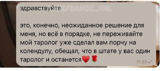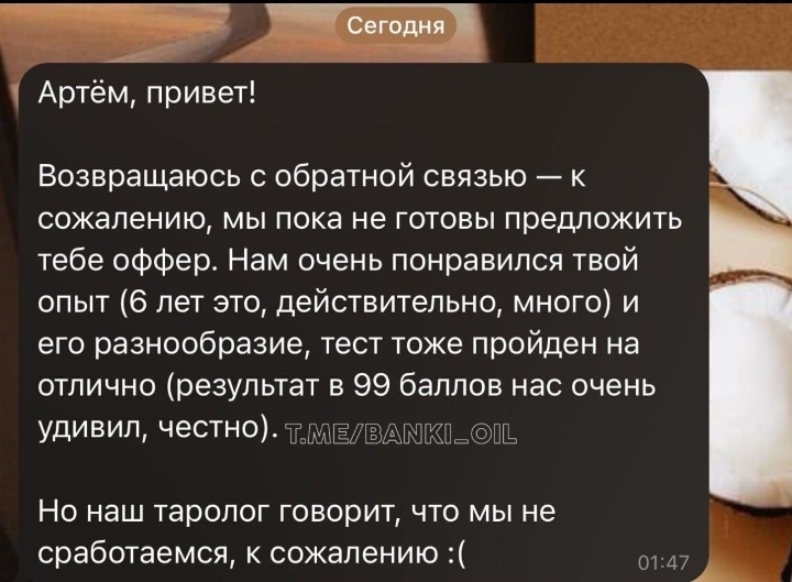 Комический виртуальный диалог между работодателем и соискателем представлен на двух прикрепленных выше фотографиях: когда в процесс поиска кандидата на место работы вмешиваются потусторонние силы в виде карт Таро и таролога. А соискатель, получив такой странный отказ, отвечает в том же стиле.