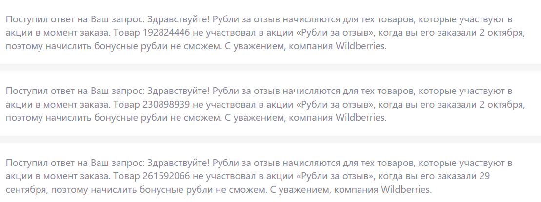 Три идентичных ответа на три обращения - товар в момент заказа не участвовал в акции "Рубли за отзыв". Я просто в шоке с такой наглости, ведь это ложь. Отправляю им свои скриншоты, после этого они сменили ответ, говорят: "Вы не попали в акцию, количество товаров по акции ограничено". А вот этого условия уже не было. Я до заказа товаров уточняла у поддержки условия, и они мне ответили следующее:
