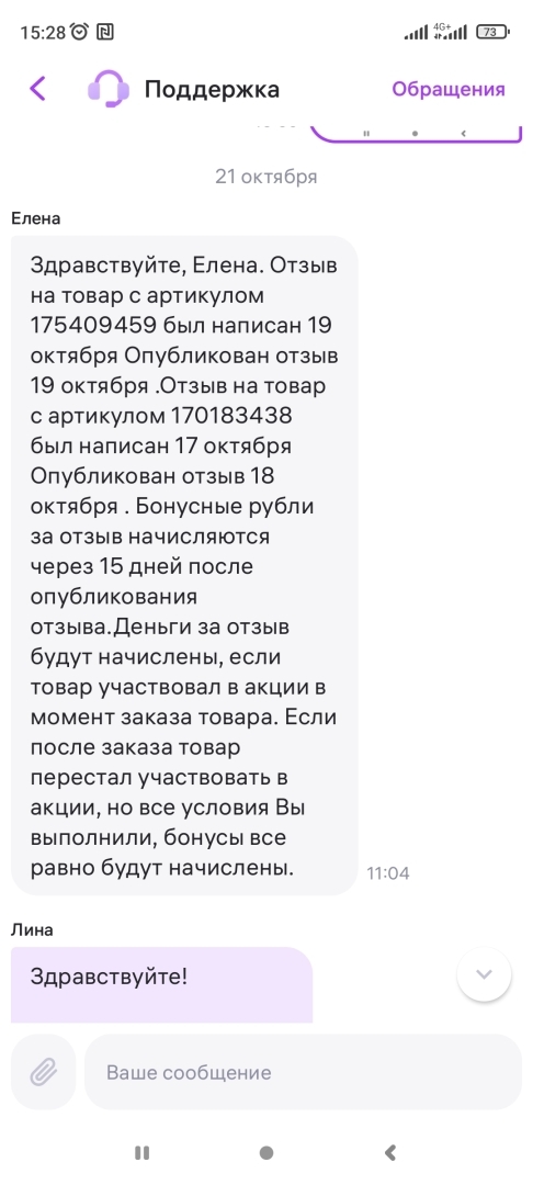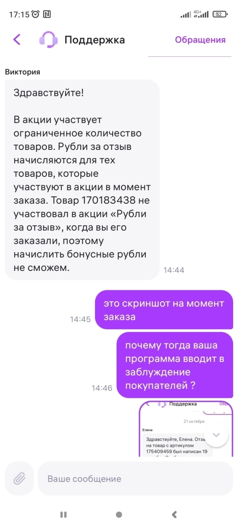 Три идентичных ответа на три обращения - товар в момент заказа не участвовал в акции "Рубли за отзыв". Я просто в шоке с такой наглости, ведь это ложь. Отправляю им свои скриншоты, после этого они сменили ответ, говорят: "Вы не попали в акцию, количество товаров по акции ограничено". А вот этого условия уже не было. Я до заказа товаров уточняла у поддержки условия, и они мне ответили следующее: