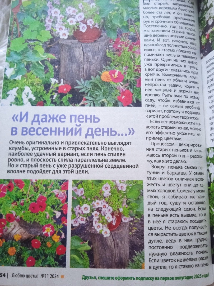 Многие из Вас знают, что я постоянный автор дачных журналов "Моя прекрасная дача" и "Люблю цветы".В данных журналах я делюсь своим опытом, своими знаниями, своими результатами.Мое увлечение дачей это не просто хобби, но и дополнительный источник заработка.В этот раз гонорар мне принес мой пень. "И даже пень в весенний день" может быть красивым, если к проблеме подойти творчески. Красивая декорация пня цветами мой первый опыт ландшафтного дизайна.Своим опытом мне захотелось поделиться и написать в журнал "Люблю цветы".Сделав фотографии , я написала небольшую статью и отправила по электронной почте в редакцию. Через пару месяцев моя заметка с красивыми фотографиями появилась на страницах журнала. Мне очень приятно, когда мое творчество печатается в журнале, который продается по всей России.
