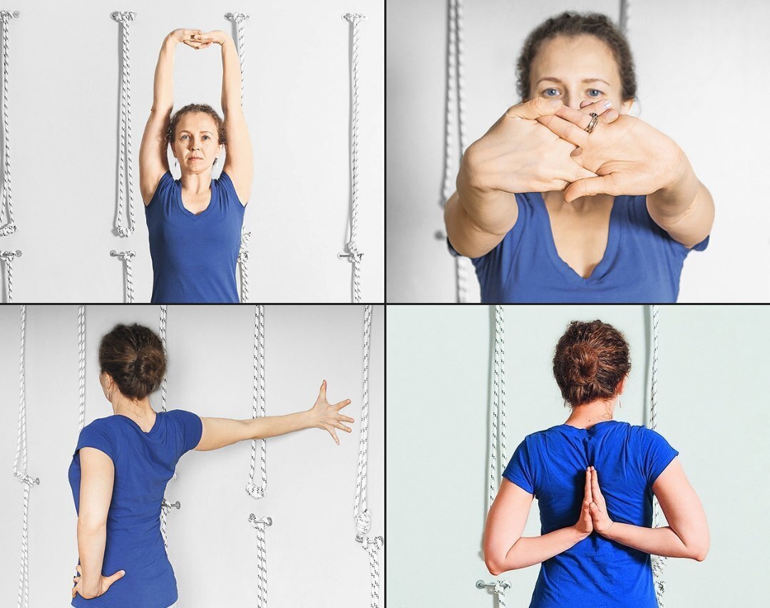 Этот аспект практики не только укрепляет мускулатуру рук, но и способствует гибкости запястий. Переплетите пальцы и вытяните их вперед, вращая плечи наружу. Затем поднимите руки вверх, открывая ладони к потолку. Старайтесь выпрямить все пальцы и поднимать мизинцы выше больших. Держите положение 30 секунд, после чего поменяйте положение рук. Это упражнение не только расслабляет, но и заряжает энергией.