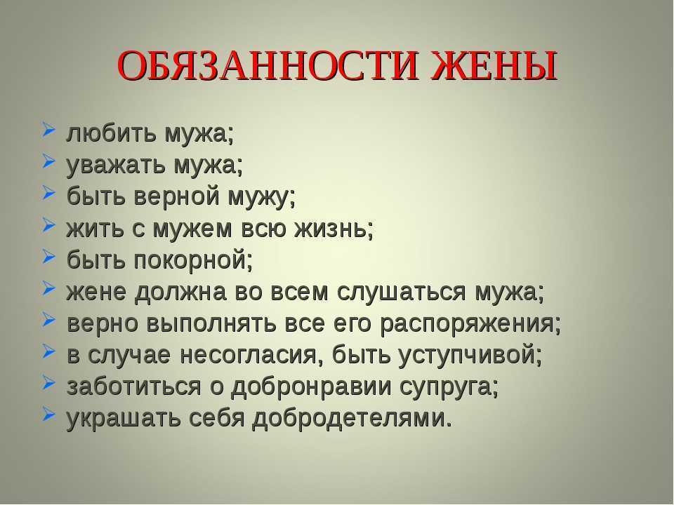 Ну вот это у вас запросы и фантазии! Быть покорной, во всём слушаться... Рабовладенческим строем попахивает. Или жена по-вашему, как собака должна быть и безоговорочно выполнять ваши команды? Скажете спрыгнуть с крыши, и она должна безоговорочно спрыгнуть? Упаси Господи от такого мужа!