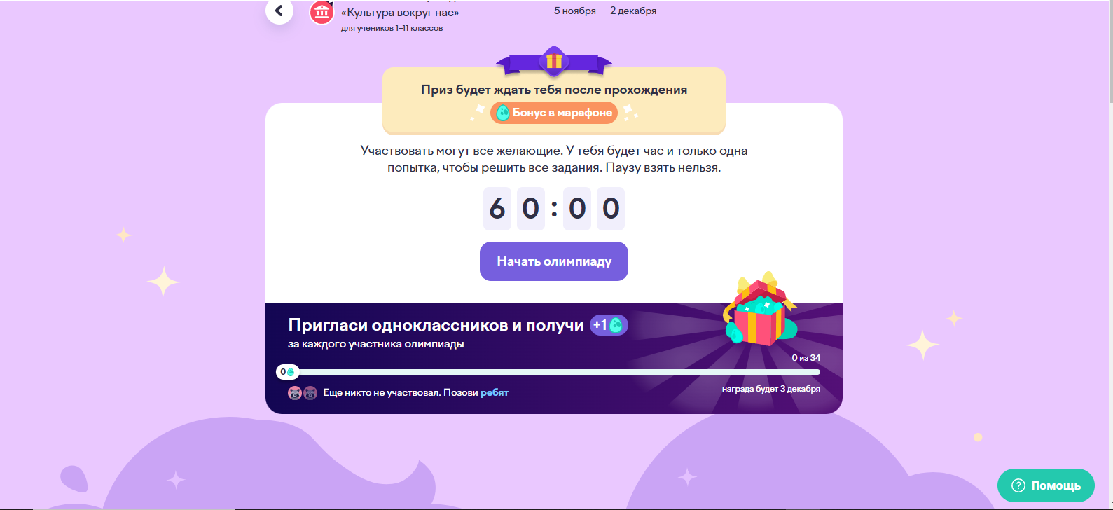 Развивает интерес к русской культуре: языку, литературе, истории и искусству. Помогает находить взаимосвязи между русской культурой и историей. Тренирует эрудицию и наглядно-образное мышление. Не требует специальных знаний. В зависимости от результата ты получишь: диплом победителя похвальная грамота сертификат участника.