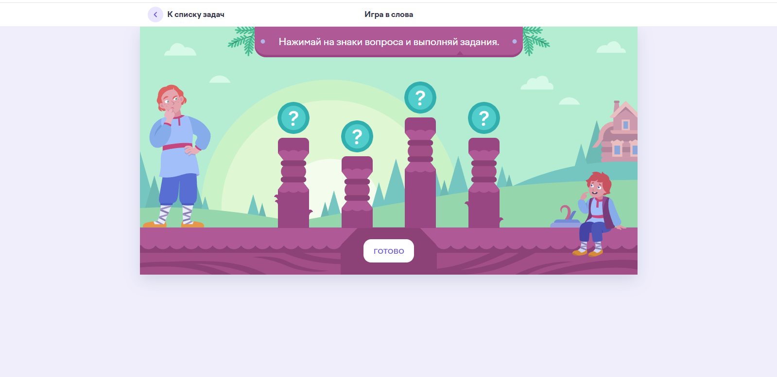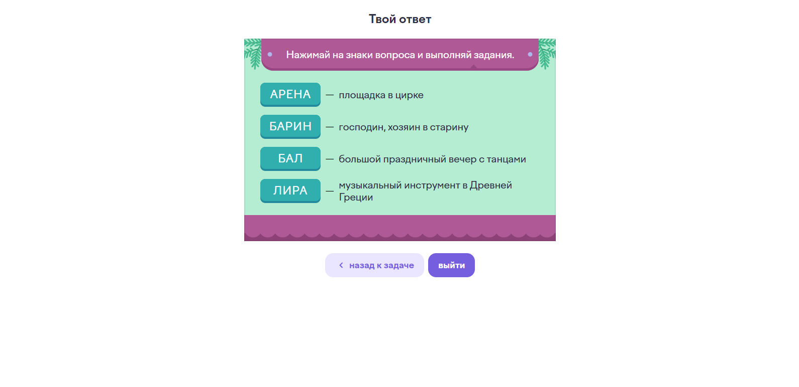 Нажимай на знаки вопроса и выполняй задания. Составь из слова "балерина" новое слово: Арена. Барин. Бал. Лира. Думаю, тут ничего сложного нет, хотя, многие дети не знают что такое лира.