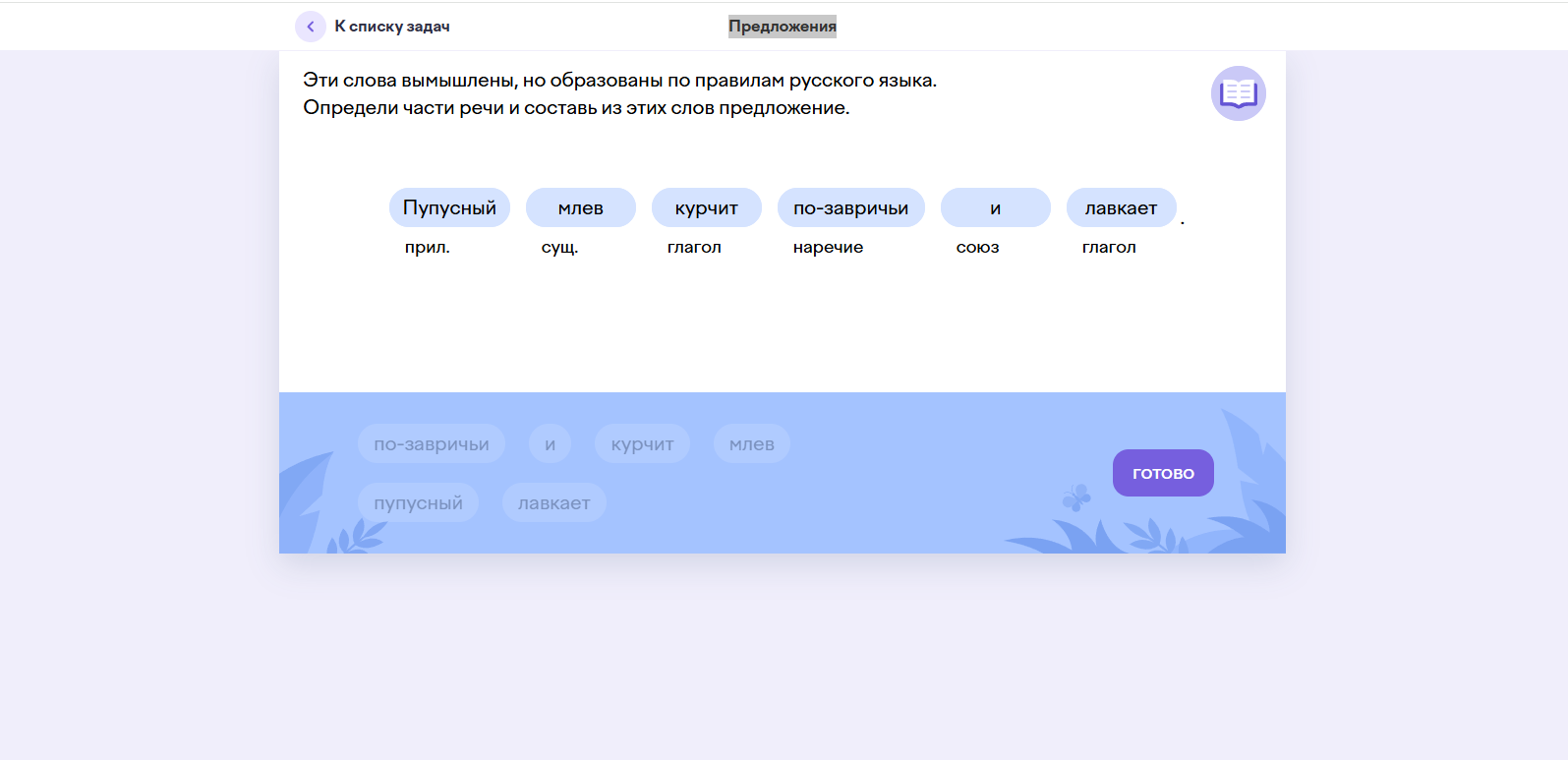 Это сложное задание и тут потребуется родительская помощь. "Слова вымышлены, но образованы по правилам русского языка. Определи часть речи и составь из этих слов предложение". По-завричьи, и, курчит, млев, пупусный, лавкает. Ответы на скрине.