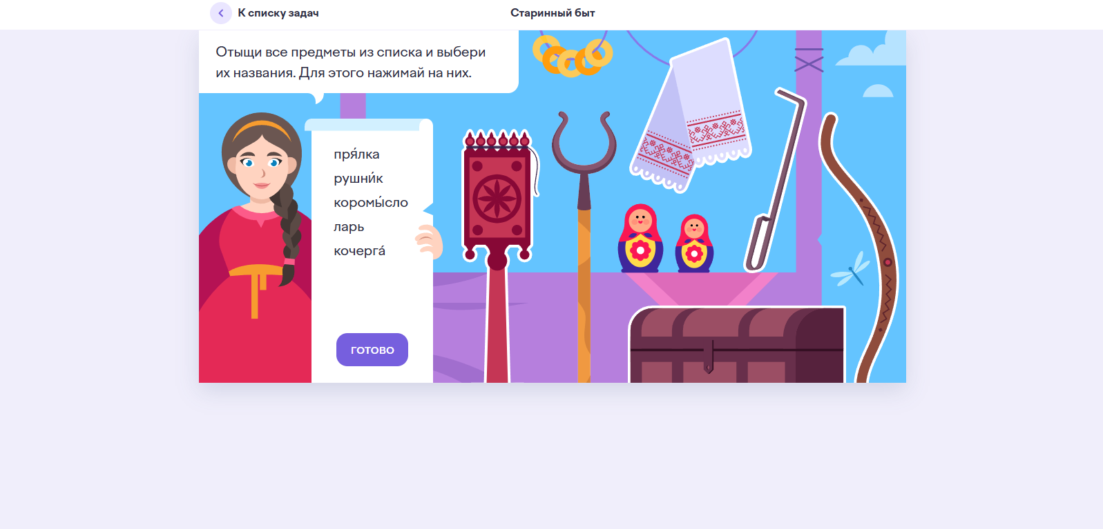 Нужно отыскать все предметы из списка и подобрать для них названия. Честно, не все дети знают что это за предметы и для чего они. Пришлось объяснять.