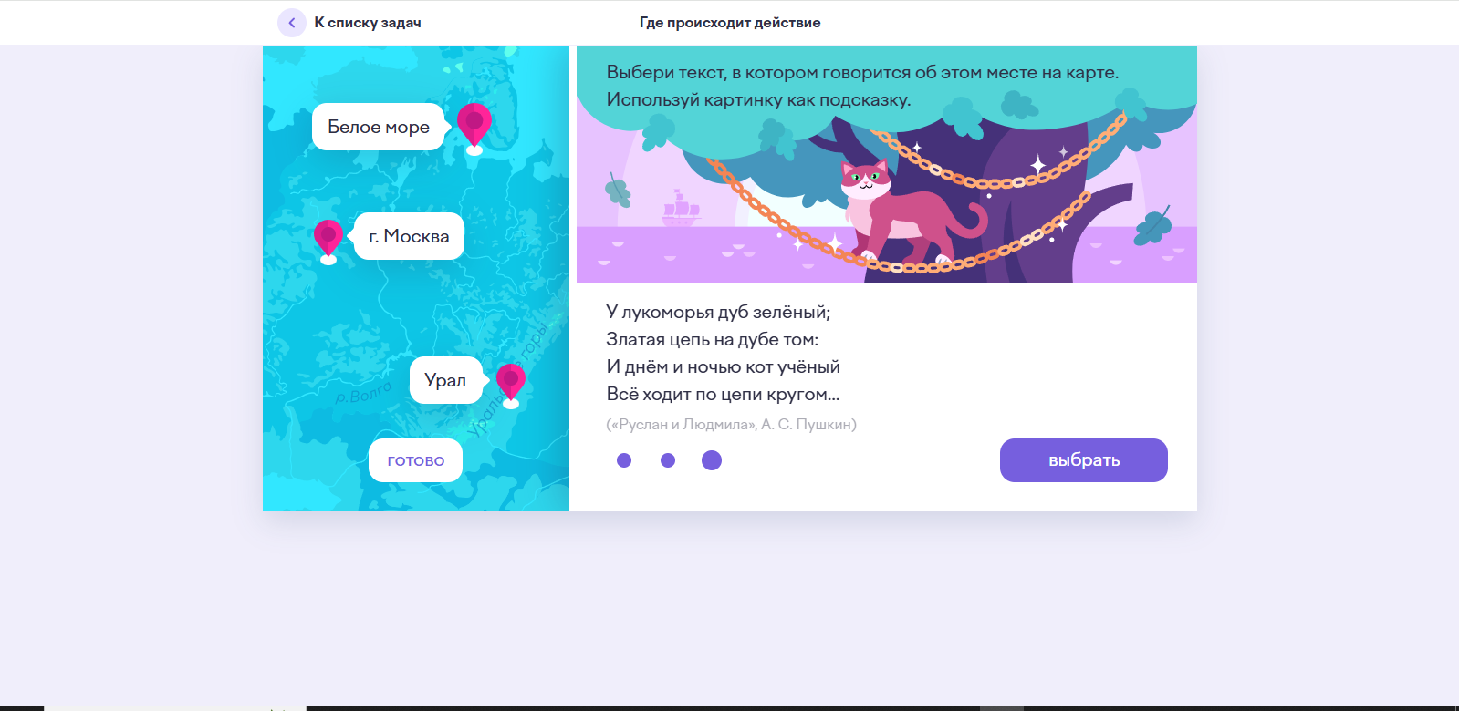 Выбери текст, в котором говорится об этом месте на карте. Используй картинку, как подсказку. У Лукоморья дуб зеленый - Белое море. Дядя Степа - Москва. Малахитовая шкатулка - Урал. Довольно сложный вопрос оказался для многих детей., т.к географии в начальных классах нет.