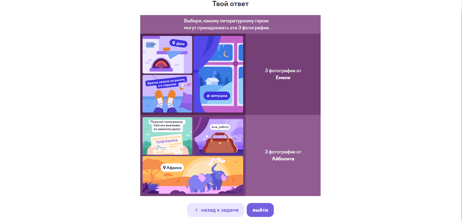 2 задания, в каждом по 3 фото. Правильные ответы: Емеля. Айболит.