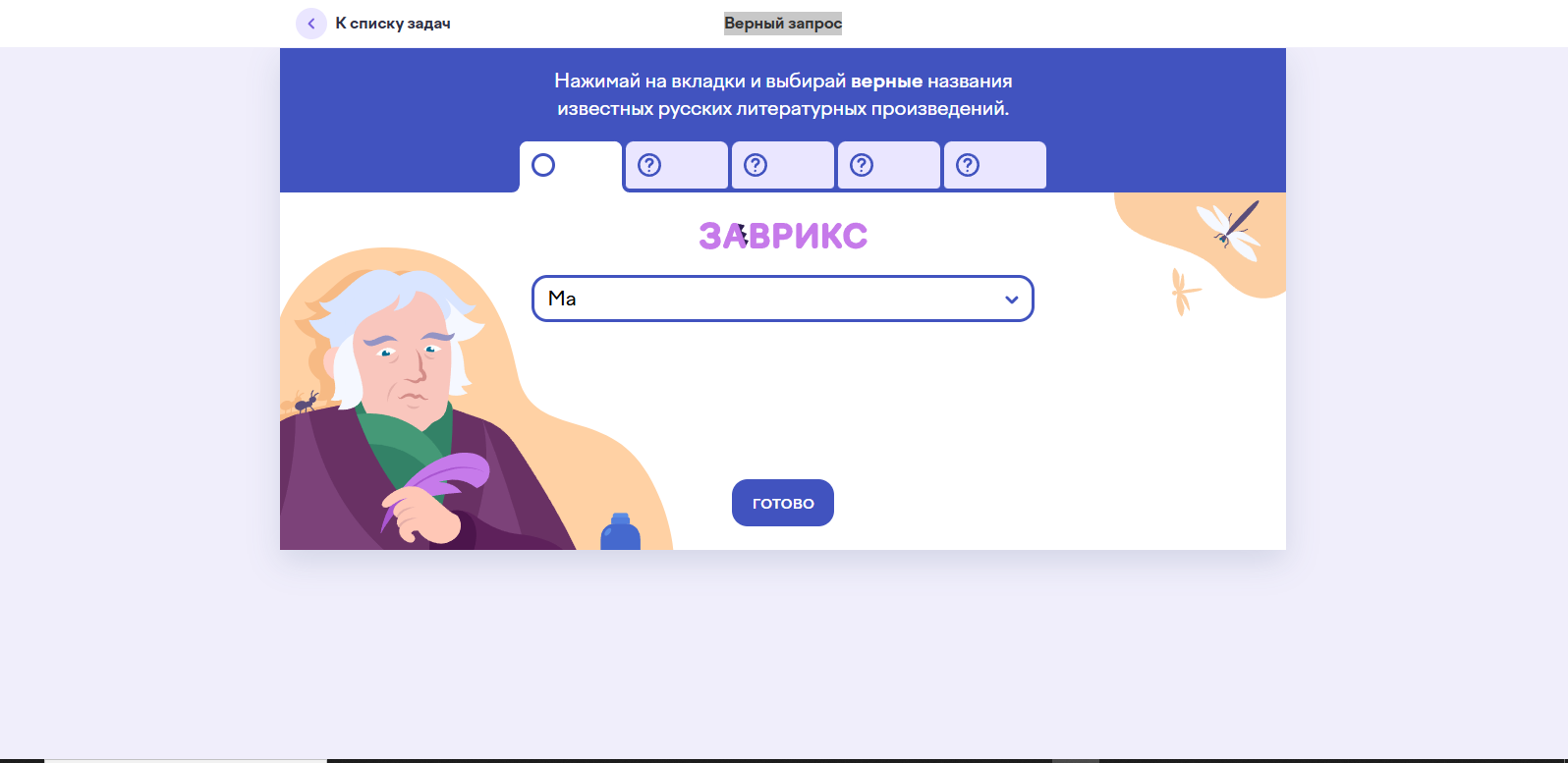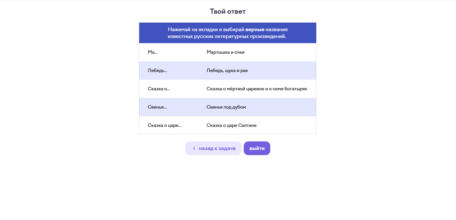 Нужно нажимать на вкладки и выбирать названия известных русских литературных произведений. Идем по порядку: Мартышка и очки. Лебедь щука и рак. Сказка о мертвой царевне и семи богатырях. Свинья под дубом. Сказка о царе Салтане.