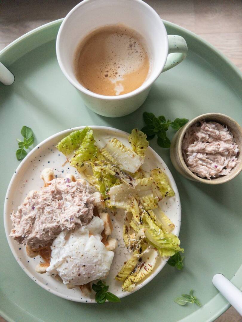 7. Собираем завтрак: на вафлю выкладываем риет и пашот.