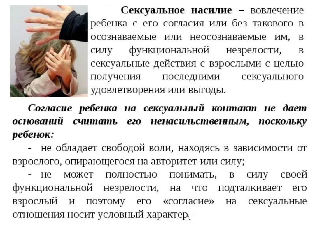 С взрослением, когда ребёнок уже интересуется сексуальными связями, и вы даже можете заметить, что сын или дочь смотрят видеоролики эротического и порнографического содержания (они очень доступны в смартфонах, где не стоит родительский контроль, а у многих он не стоит, достаточно в поисковик браузера написать слово порно, выйдет много результатов с расплывчатыми картинками, но стоит перейти во вкладку видео, и вот возможность просмотреть ролики 18+), стоит говорить о том, что такое половая/сексуальная связь, как она происходит и что считается сексуальным домогательством, связью по обоюдному согласию, связью по принуждению, сексуальное насилие. А также о том, что действия сексуального характера в отношении несовершеннолетних являются преступлением и преследуются согласно уголовного кодекса и самим родителям помнить об этом, увы домашнее сексуальное насилие нередко ни в нашей стране, ни зарубежом.