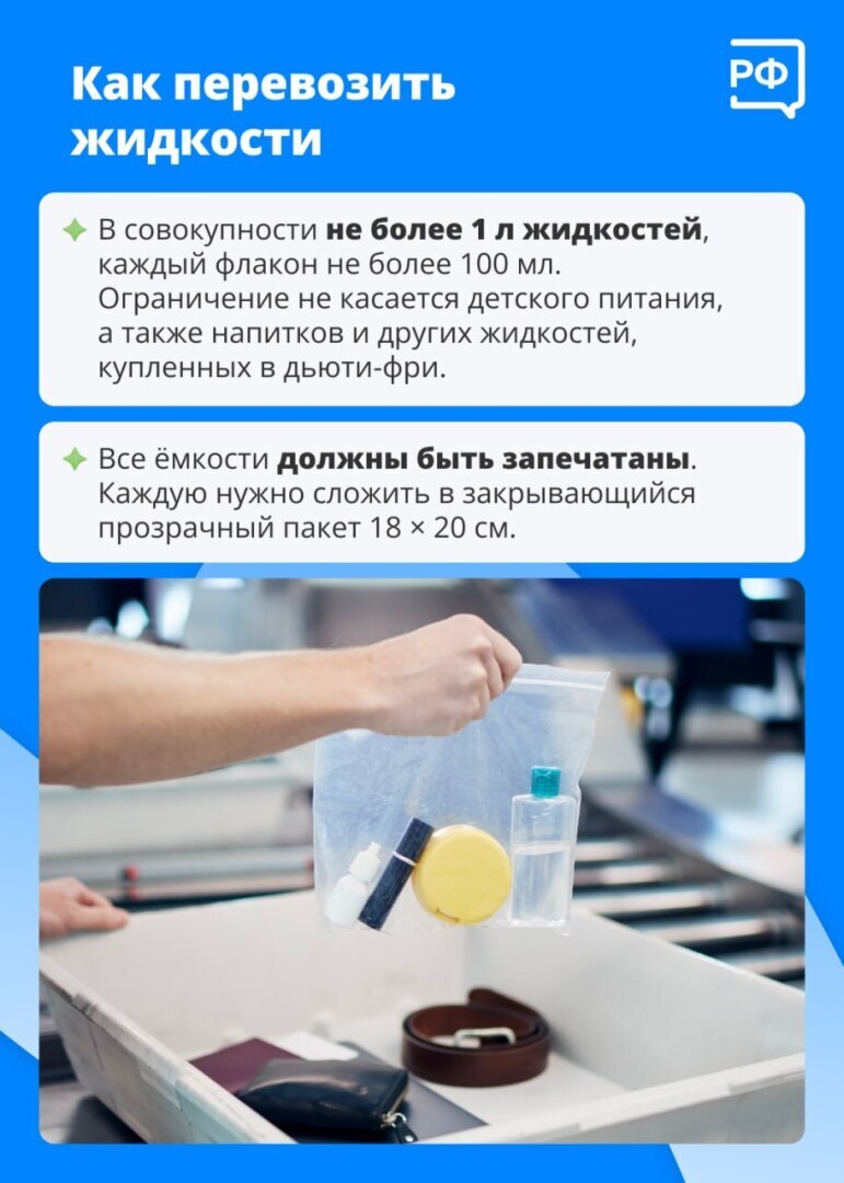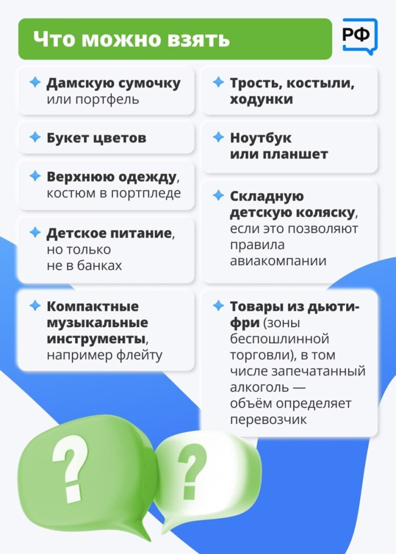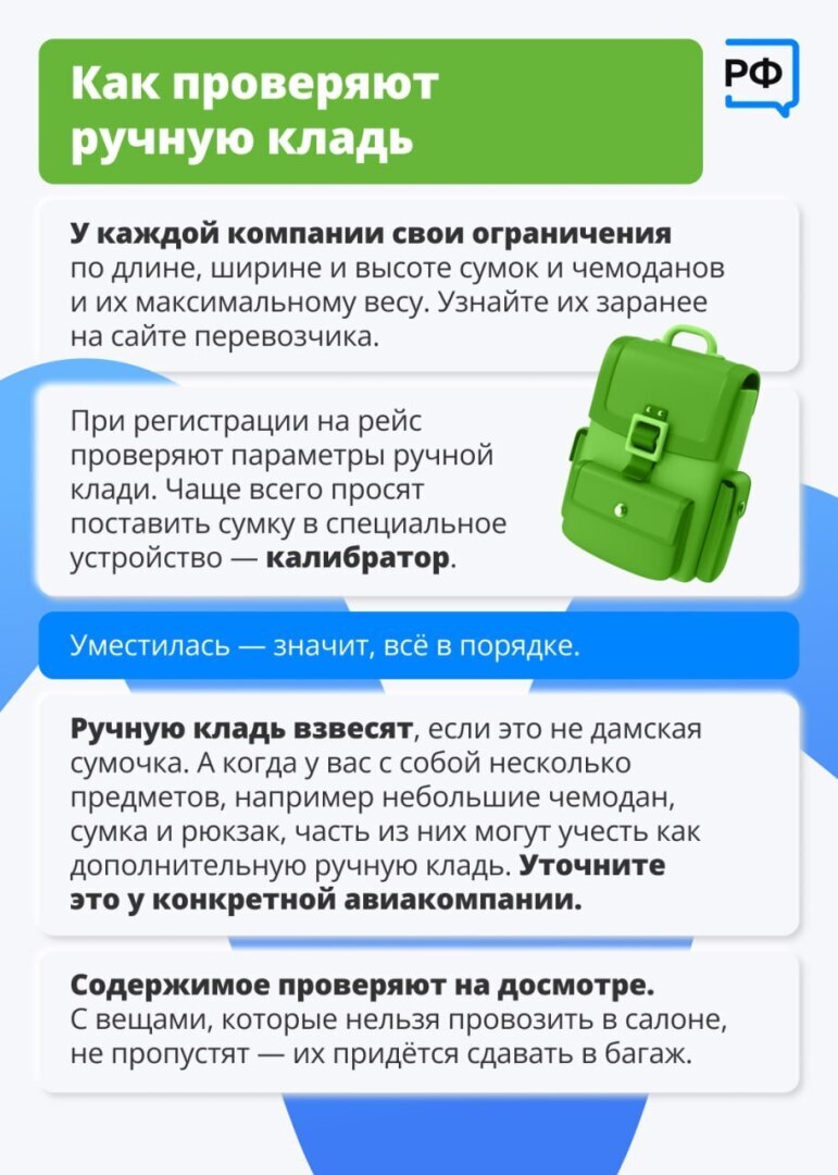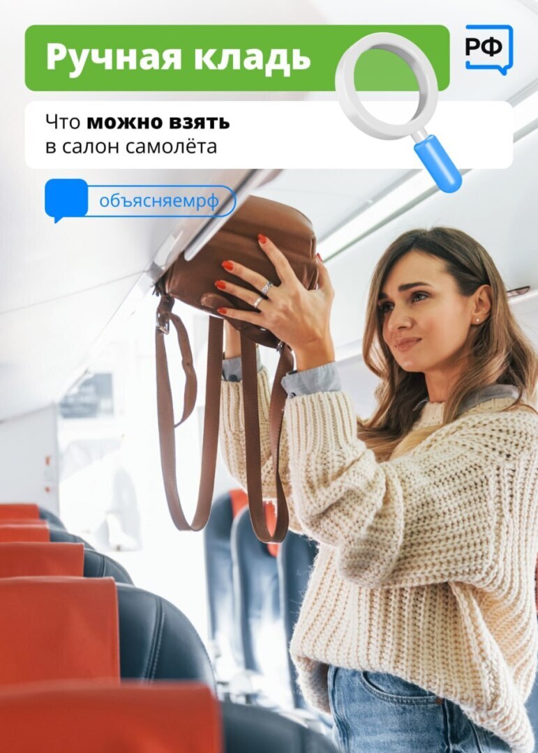 О том как собрать ручную кладь, подготовили карточки на портале Объясняем.рф (https://t.me/obyasnayemrf/19275?single)