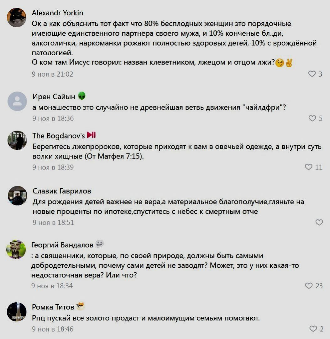 Я верующий человек и уважаю священнослужителей, но всегда помню, что в РПЦ существует такая же номенклатура, как в светском обществе и этот кабинетный поп даже близко не знает проблем в жизни народа. А вот простой батюшка, к которому в маленькую церковь каждый день приходят люди, никогда бы так не оскорбил наших женщин, главным жизненным горем которых является невозможность иметь детей по показателям состояния их здоровья.