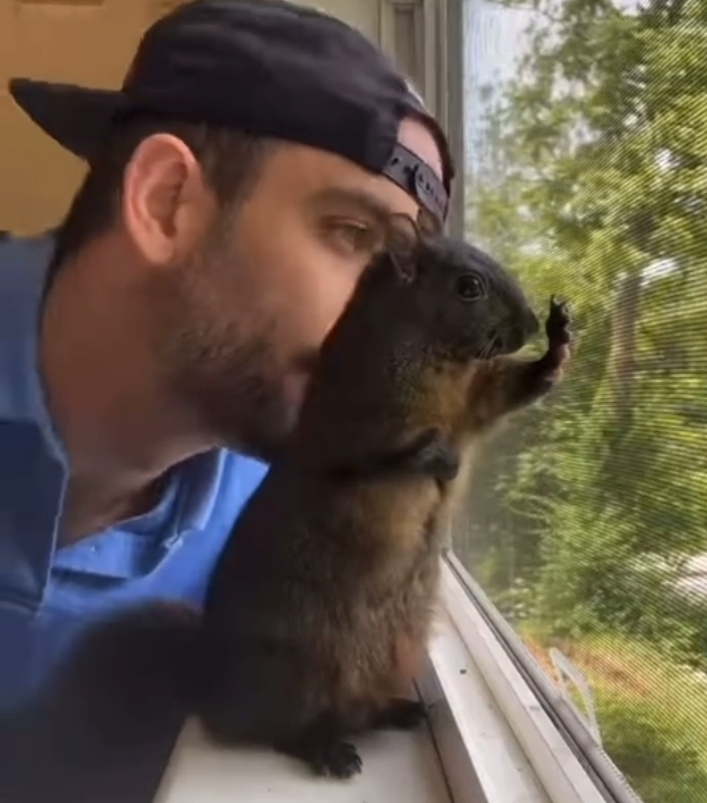 Звезда интернета - белка Пинат, она же - Арахис, со своим большим другом, спассшим и выходившим ее: