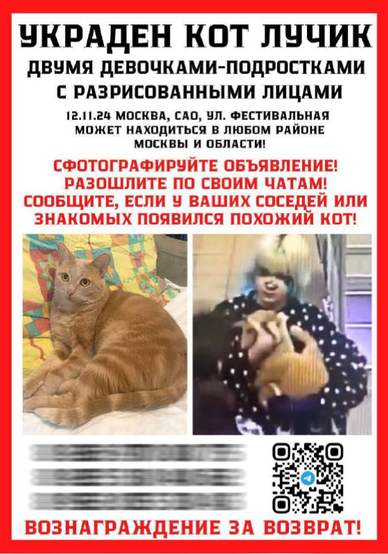 Этим случаем заинтересовались зоозащитники, которые привлекли волонтёров к поиску котейки. Вот такие объявления появились в разных районах Москвы.