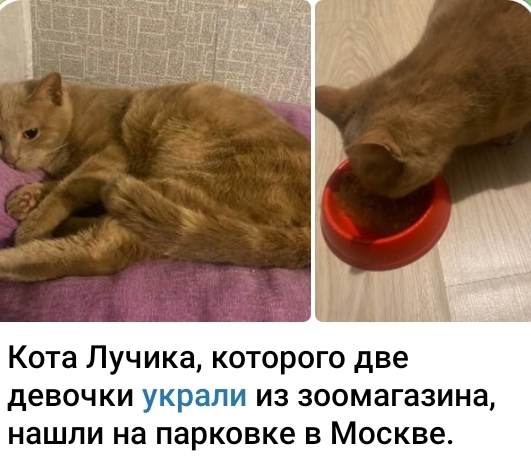 "Кота Лучика, которого две девочки украли из зоомагазина, нашли на парковке в Москве.
