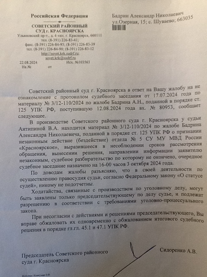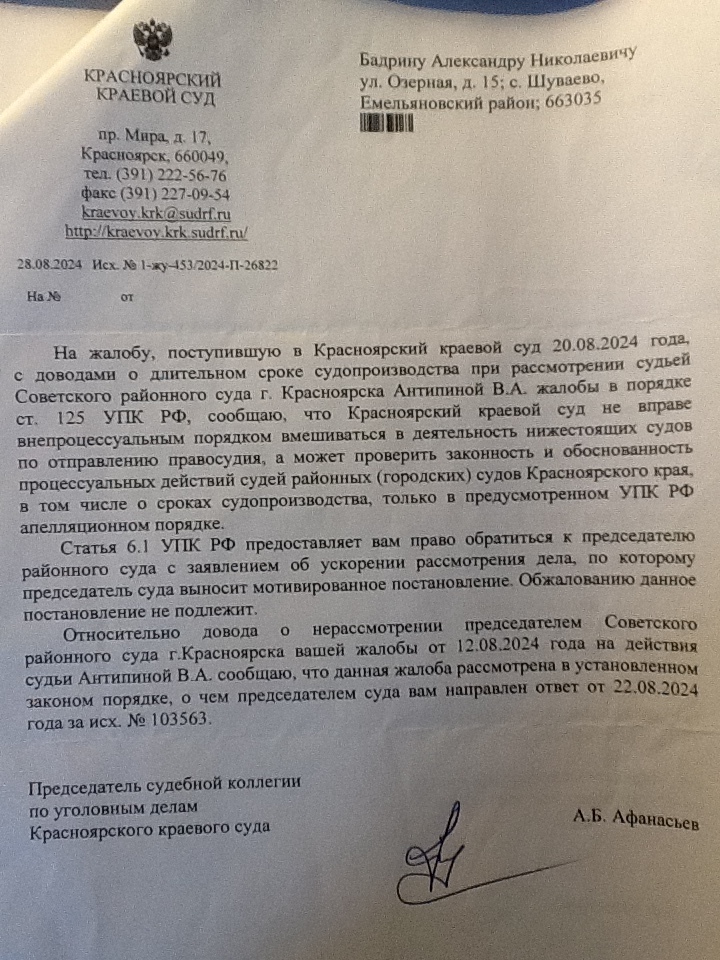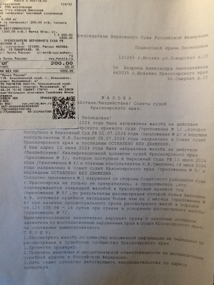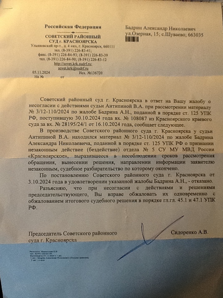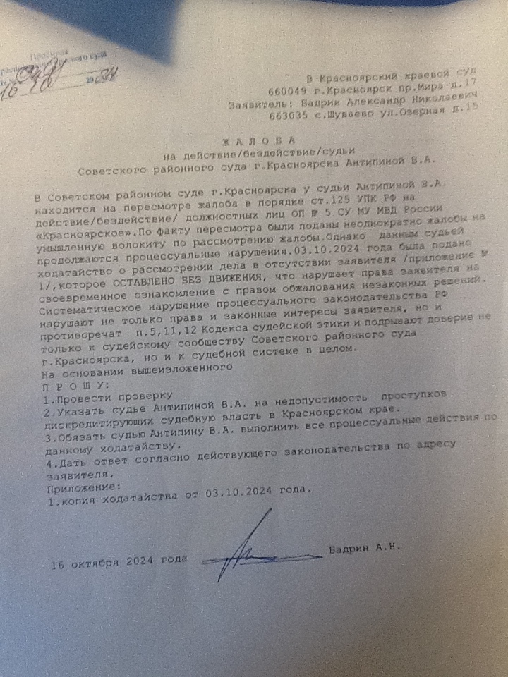 Судья Антипина А.В. вместе с председателем Советского районного суда г.Красноярска продолжают свое "темное" дело.Подаем жалобу