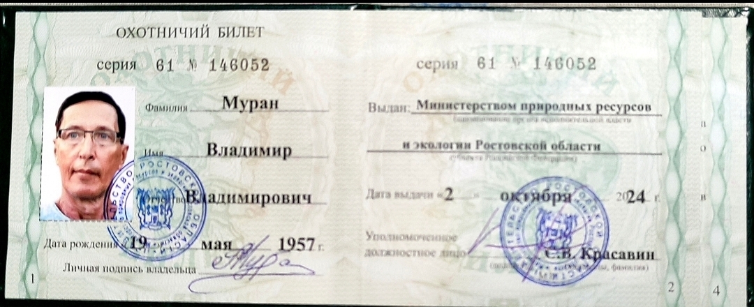 Мне не надо показывать разрешительные документы. Но справедливости ради замечу, что после фразы "Разрешение на право ношения и применения я уже получил", размещено фото охотничьего билета. И так как никакой смысловой нагрузки это фото не несет, то из контекста следует, что это и есть упомянутое разрешение.