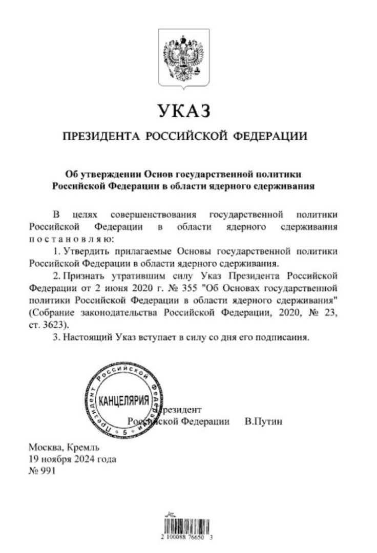 Владимир Владимирович Путин, президент Российской Федерации, издал указ, утверждающий обновлённую версию ядерной доктрины страны. Этот документ вступает в силу с момента его официального опубликования, то есть с 19 ноября.