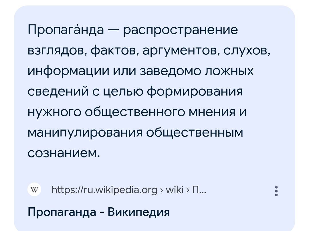 Бред- это вся та ахинея, которую вы несёте. И слово "пропаганда" здесь вполне уместно. Специально для Вас, кастрюлеголового ципсошника, поясняю "пропаганда- это распространение ВЗГЛЯДОВ, фактов, аргументов, СЛУХОВ, информации или ЗВЕДОМО ЛОЖНЫХ СВЕДЕНИЙ с целью формирования нужного общественного мнения и манипулирования общественным сознанием". Чем вы здесь, собственно, и занимаетесь, усердно стараясь расшатать традиционные взгляды на семью и отношения. И да, умные уже всё про вас поняли. Держите памятку о понятии слова "пропаганда" и бонусом подарок, олицетворяющий вас😁 не благодарите😆