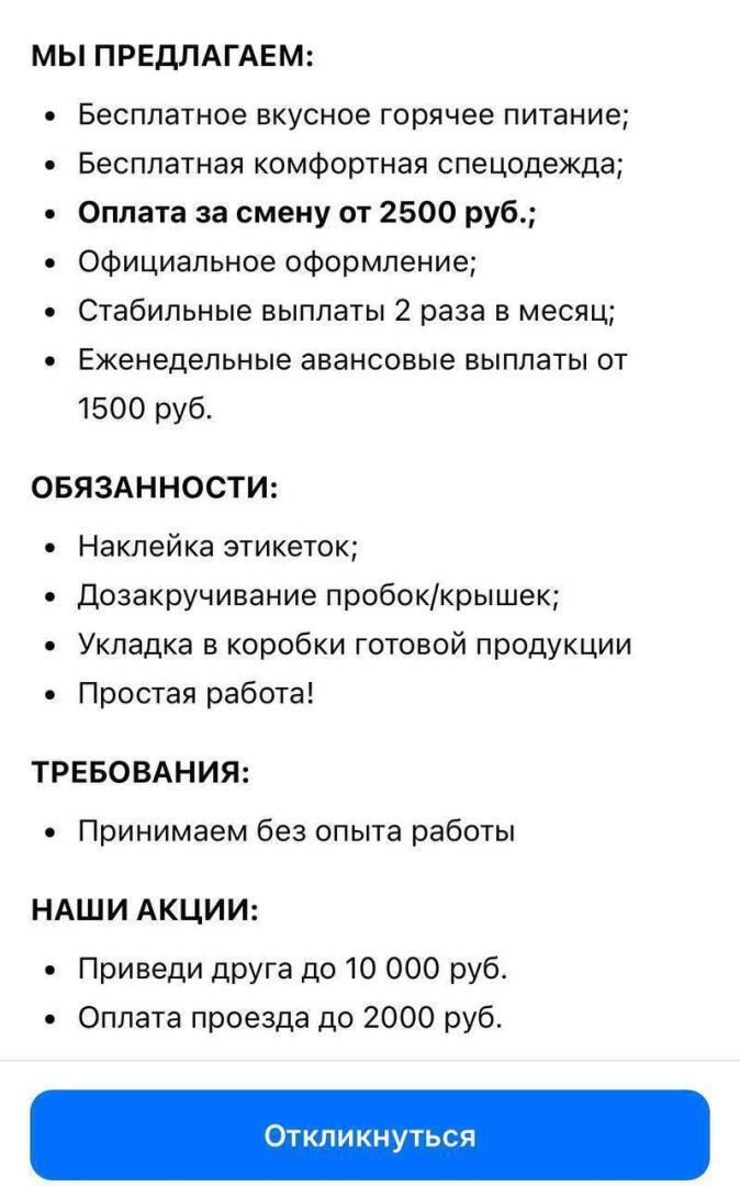 Работодатели предлагают зарплату до 310 000 рублей даже без опыта работы. Основные обязанности включают наклеивание этикеток, закручивание крышек и упаковку готовой продукции.