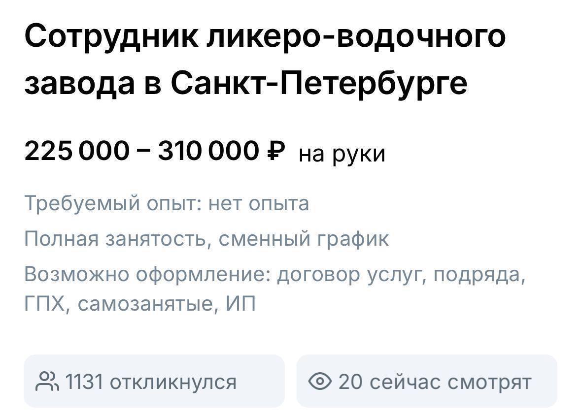 В Питере самой востребованной вакансией стал сотрудник ликеро-водочного завода, — аналитики.