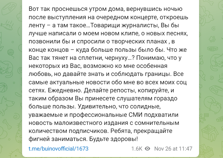 Ну и конечно же, слухи дошли до самого певца. Александр Буйнов лично обратился в своём Telegram-канале к журналистам с просьбой прекратить «фигнёй заниматься».