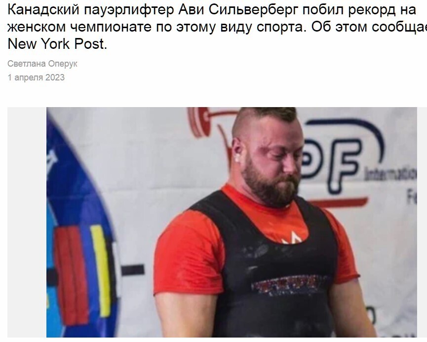 А что вслед за плавцом и боксёром, которые назвались женщинами и выиграли соревнования, тяжёлоатлет по фамилии Сильверберг (серебряная гора), стал чемпионом среди женщин, установив новый мировой рекорд в жиме штанги лёжа.