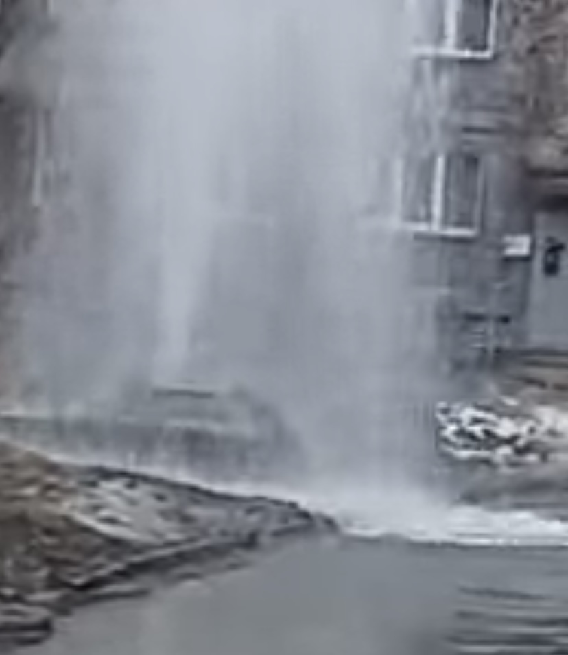 Во дворе одного жилого дома из под земли хлынула огромная струя воды, прорвал трубопровод. Высота фонтана достигала 3 этажей.