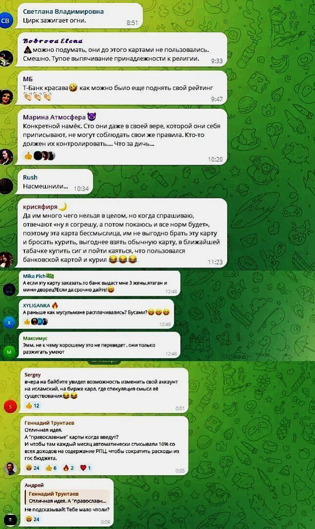 Вот ведь, наверное, ржёт удравший из России Олег Тиньков над выкрутасами своего бывшего банка. А сколько сбрендивших мусульман приобретут данный продукт – покажет время. А нам остаётся ждать появления «христианской» карты с запретами оплаты эскорт-агентств и услуг заказных убийц. Действительно, «цирк зажигает огни».