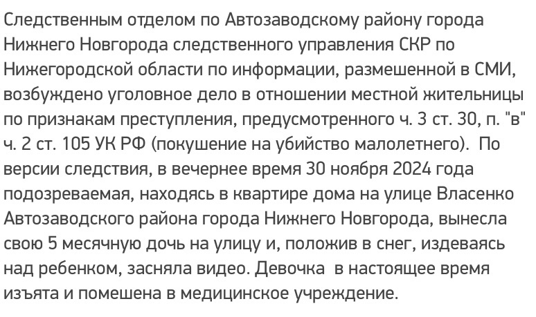 Следственным комитетом было заведено уголовное дело, а мамаша стала его главным фигурантом. Надеюсь поблажек никаких для нее не будет.