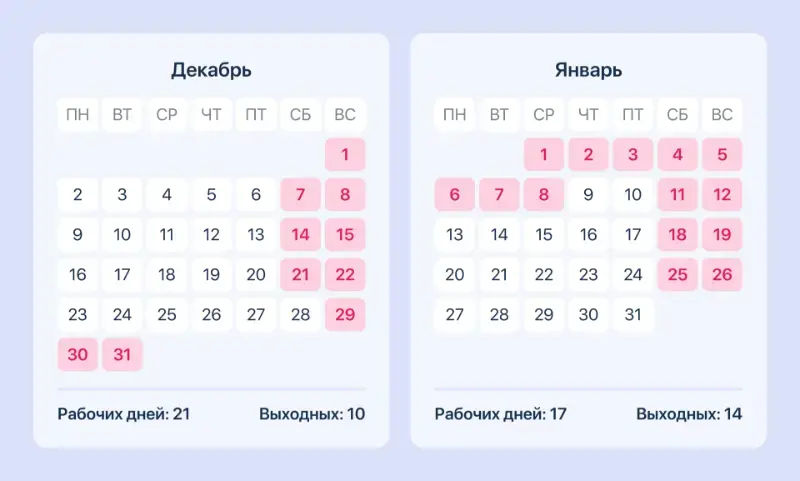 Этот месяц включает 31 день: 21 рабочий и 10 выходных. Выходные дни приходятся на 1, 7-8, 14-15, 21-22, а также 29, 30 и 31 декабря. Новогодние каникулы начнутся 29 декабря и продлятся до 8 января, предоставляя 11 дней для отдыха.