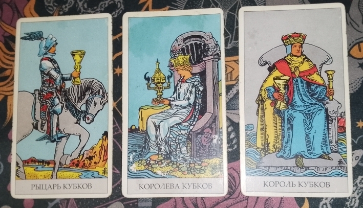 У нас из масти кубков осталось 3 карты: рыцарь, королева и король кубков 🏆 то есть 2 фигурные и одна это Рыцарь. А рыцари у нас, повторюсь, всегда обозначают атмосферу. По рыцарю кубков какая же у нас может быть атмосфера? Посмотрите пожалуйста на саму карту 🃏 на ней изображена красивая лошадка, 🏇 которая голопирует на фоне водопада 🌊 изображëн красивый рыцарь, который держит кубок 🏆 у него открыто забрало, он улыбается, то есть в принципе атмосфера в этой карте очень приятная, эмоциональная. Поэтому, на вопрос❓ “как пройдëт свидание?” 👫 по этой карте оно пройдëт в приятной, комфортной, эмоциональной атмосфере. Если вопрос ❓ допустим, “как пройдëт работа” 💼 ну для работы, это знаете, скорее такая расхлябанная карта 🤪 вероятнее всего, что работы не будет, и на рабочем месте будет только “хи-хи, да ха-ха”, поэтому, именно для факта работы не очень, как для рабочего дня, то впринципе атмосфера будет приятная и лëгкая, скажем, атмосфера корпоратива 💃 Как быть, если эта карта выпадает в ответ на вопрос 🙋 ”будет ли дома скандал?” - мы помним, что кубки у нас, кроме всего прочего ещё обозначают и эмоции, то есть это будет говорить о том, что разговор в доме 🏡 будет эмоциональным, не забываем да, что кубки 🏆 у нас, как плюс ➕ эмоции, так и минус - это эмоции тоже, поэтому, если в окружении данной карты, Вы видите не хорошие карты, мечи ⚔️ например, фигурная карта, 5, 7, Туз мечей, то это даёт указание на то, что выяснение отношений будет эмоциональным, то есть слезливым, плаксливым, скорее всего будет какая-то истерика, и так же эта карта призывает Вас не включать лишнии эмоции. Допустим, если Вы задали вопрос❓ “как мне правильно себя вести?”, и выпадает эта карта, то подсказка в том, что ситуация будет требовать Вашего эмоционального включения, поэтому, постарайтесь экономить свои эмоции. Впринципе, основное по Рыцарю Кубков 🏆 это атмосфера, в которой будет происходить событие, и если вокруг негативные карты, то будет говорить об истериках. Если позитивные карты, то это хорошо проведëнный вечер.