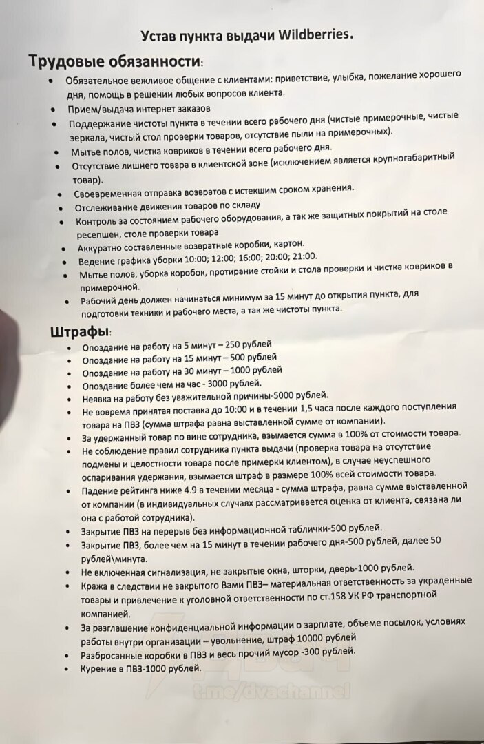 Кто-то из менеджеров самого успешного в России маркетплейса, возможно, уволившись из компании (а может и нет), решил поделиться с пользователями соцсетей одним интересным документом. Это Устав для работников пункта выдачи Wildberries.