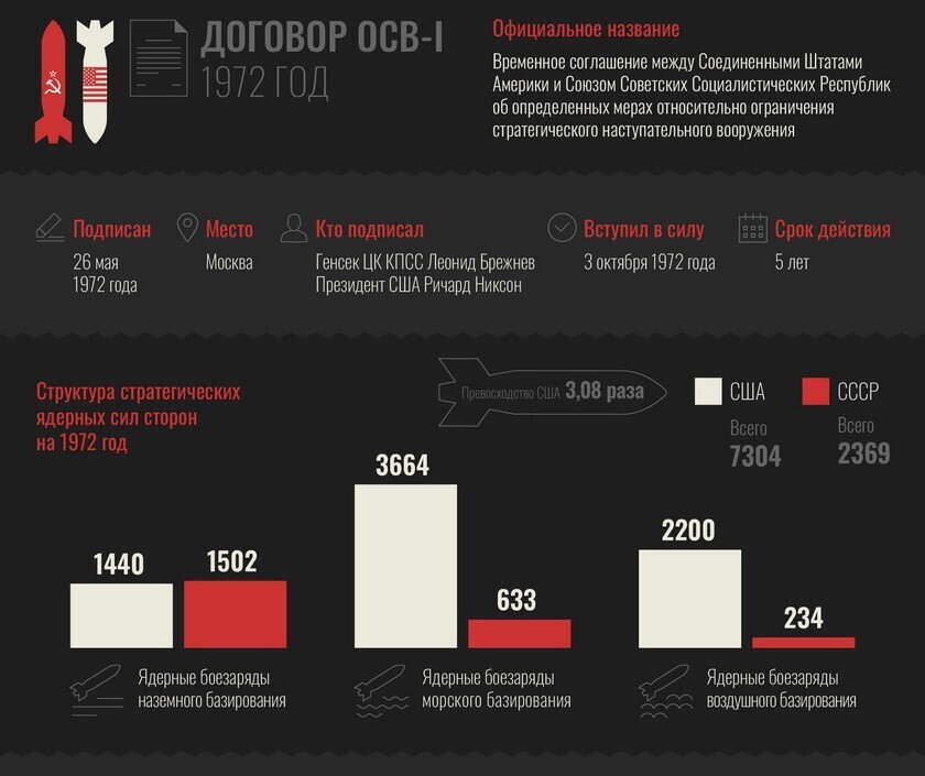 Первые переговоры о сокращение стратегических ядерных сил начались после кризиса в Чехословакии в 1968 году. И только в 1972 году руководители двух сверхдержав - Леонид Брежнев и Ричард Никсон подписали первый договор (временное соглашение) о запрете наращивания количества баллистических межконтинентальных ракет - Договор ОСВ - I.