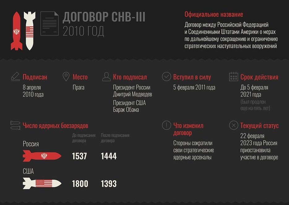 В последний раз за стол подписания договоров руководители стран сели в 2010 году. Тогда Дмитрий Медведев (президент России) и Барак Обама (президент США) подписали в Праге договор о сокращении стратегических наступательных вооружений — договор СНВ-III. Этот договор актуален и сегодня.